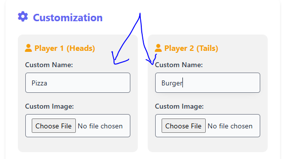 In the “Player 1” and “Player 2” sections, you can rename each side of the coin. For instance, replace “Heads” with “Win” and “Tails” with “Lose,” or use labels like “Pizza” vs. “Burger” for fun decision-making.