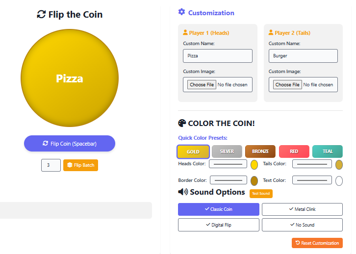 The Flip a Coin Custom tool brings creativity and personality to the classic coin flip. With options to customize names, upload images, change colors, and select sounds, you can make every toss your own. Whether you’re deciding something serious or just looking for fun, this tool gives you full control and instant, fair results.