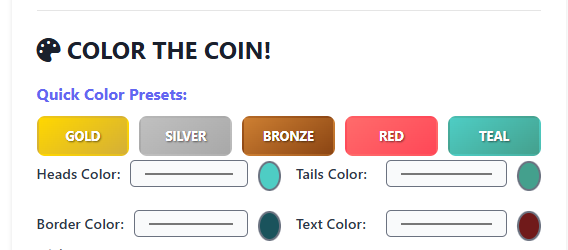 Under the “Color the Coin” section, you can select from quick presets such as Gold, Silver, Bronze, Red, or Teal, or manually adjust the colors for heads, tails, border, and text.
