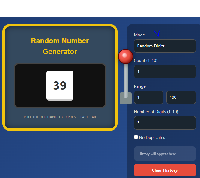| Mode | Switch between Random Number (range-based) and Random Digits (digit-count-based). |