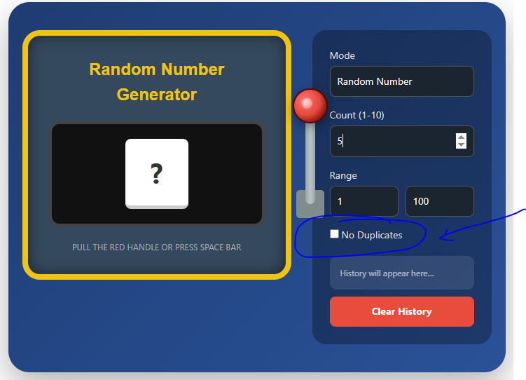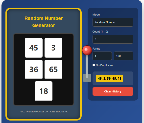 When you generate multiple numbers (Count > 1), No Duplicates ensures each number in that spin is unique. For example, if you spin for 5 numbers between 1 and 10 with No Duplicates on, you’ll get 5 different numbers — no repeats. It’s like drawing from a hat without putting tickets back.